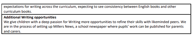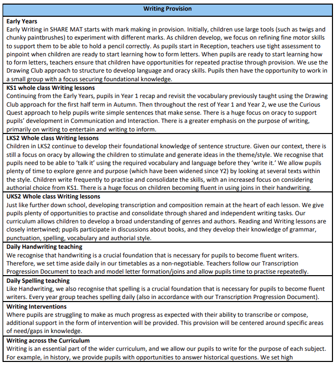 Our aim is to promote the love of writing for all, ensuring that our pupils secure valuable and transferable skills for future use. We understand the importance of children becoming fluent writers and its impact on the wider curriculum. We strive to make writing interesting and engaging, whilst developing their transcription and composition skills quickly to secure good standards. We aim to develop writing ability by developing knowledge/skill in the following areas:
